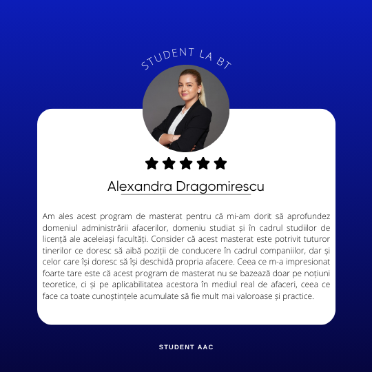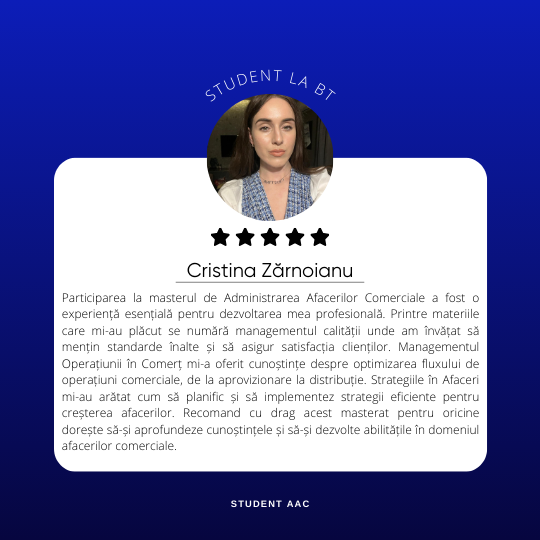 In urma absolvirii programului de master Administrarea Afacerilor Comerciale pot sa admit ca sunt mandru ca am parcurs acest program de studii, intrucat am reusit sa acumulez informatii care mi-au dezvoltat orizontul cunoasterii in domeniul economic. De asemenea, am avut onoarea de a beneficia de inaltul profesionalism al cadrelor didactice si am avut deosebita placere de a colabora cu niste colegi extraordinari. Datorita acestor aspecte si datorita efortului personal am reusit sa dobandesc calitatea de sef de promotie, iar pe aceasta cale doresc sa le urez succes generatiilor viitoare.